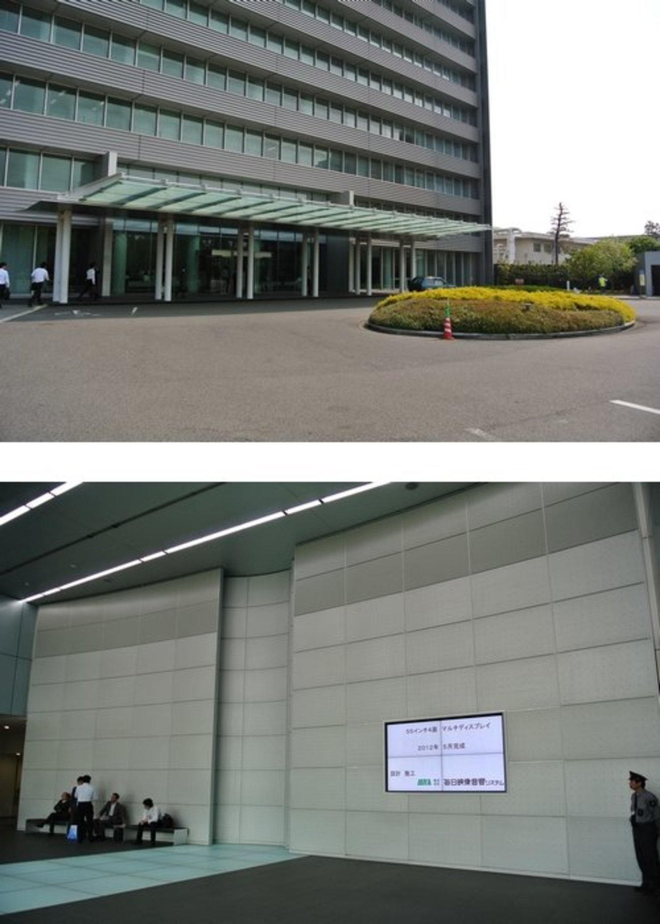 - <上>豊田市にある本社技術部の技術本館エントランス外観。<下>技術本館エントランスの様子。日中陽が差し込んでも視認性は良い。