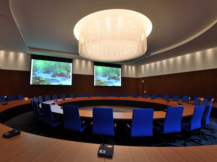 - 大会議室には大型スクリーンと高輝度プロジェクタ、マイクシステムを設置、簡単操作を第一に考えます。